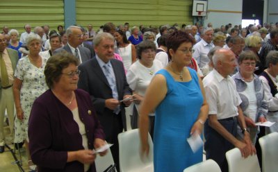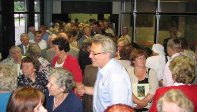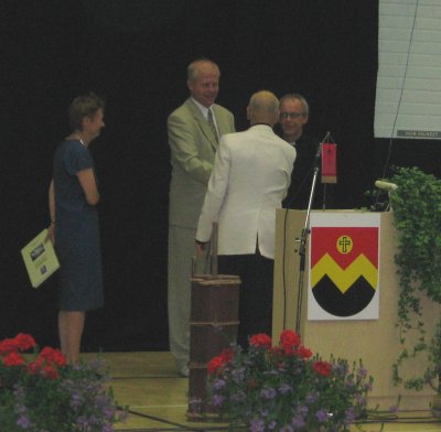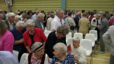 | Kirkonkylän juhlasali oli täynnä Muolaan juhlassa. | Puheenjohtajat Jorma Rämö ja Hannu Kontio sihteeri Eija Järvisen kanssa. |