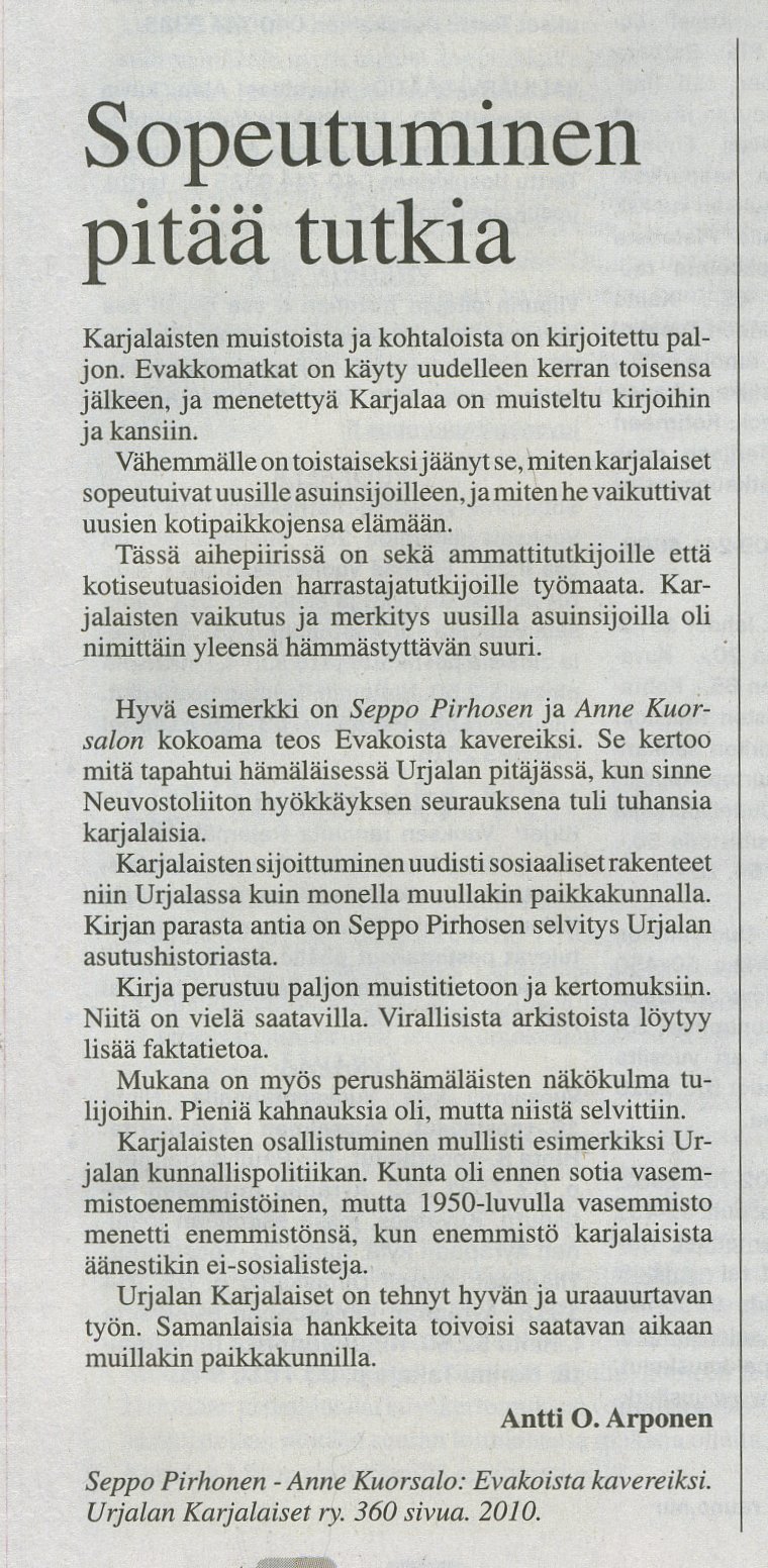 tekee mieli asettaa tämä karjalaisten tulo ja sopeutuminen