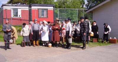 ![]() Jokioisten karjalaiset esittivät katkelman omasta evakkojunatapahtumastaan ennen vaellukselle lähtöä.Tässä esiintyjät odottamassa esityksen alkua |