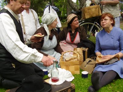 | Asko Viholainen puhui sankarimuistomerkillä. | Evästauolla maistuivat karjalnpiirakat. Osa vaeltajista oli pukeutunut sota-ajan arkivaatteisiin. |